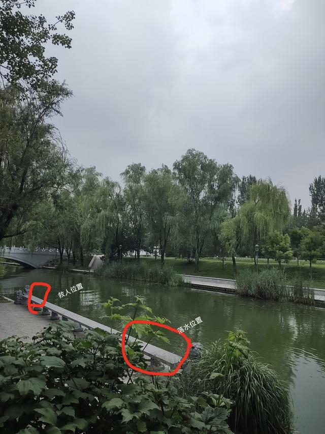 7月12日下午3点半左右,在朝阳公园问渠桥附近,夏子良正带着孩子锻炼身体。突然,他看到桥下有一名穿着白色衣服的女子掉入水中,并听到了女子同伴的呼救声。他赶快带着孩子跑到岸边,发现落水女子就在岸边,但无法自主上岸,身体也渐渐往下沉。岸上的市民试图用树枝将落水女子拖上岸,但女子似乎身体不受控制,无法抓着树枝上岸。