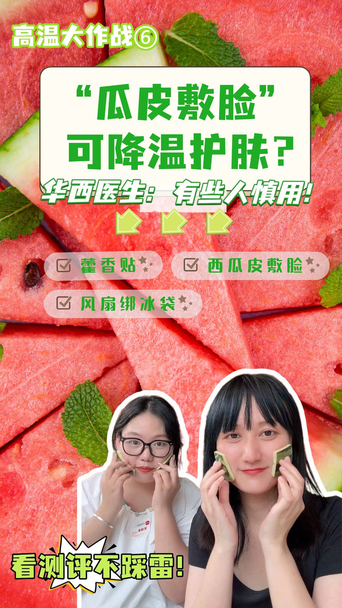 西瓜皮敷脸,原理与外敷面膜或医用敷料类似,但对于皮肤屏障受损或皮肤敏感的人群,不推荐使用西瓜皮降温。在临床中,医生会建议将面膜放入4℃冰箱冷藏后外敷降温。建议选用正规厂家生产的面膜进行降温,能减少过敏等不良反应的发生。