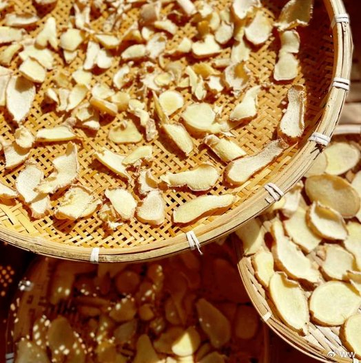 家常做法:新鲜生姜切成1-2毫米薄片,均匀铺在竹匾中(有条件可用烘干机),日照充足时每日翻动1-2次,防止变质。三日后收好密封。