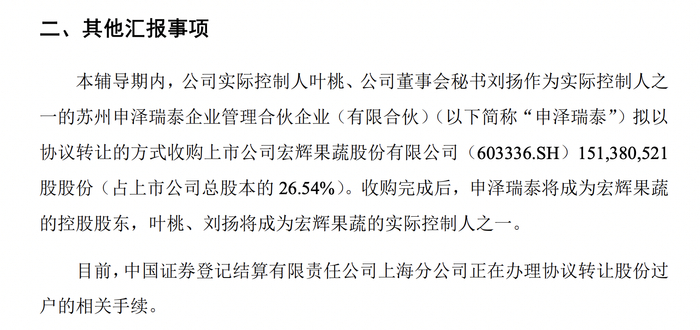 此外,本辅导期内,腾瑞制药实际控制人叶桃、公司董事会秘书刘扬作为实际控制人之一的苏州申泽瑞泰企业管理合伙企业(有限合伙)(以下简称“申泽瑞泰”)拟以协议转让的方式收购上市公司宏辉果蔬股份有限公司(603336.SH)1.51亿股股份(占上市公司总股本的26.54%)。收购完成后,申泽瑞泰将成为宏辉果蔬的控股股东,叶桃、刘扬将成为宏辉果蔬的实际控制人之一。目前,中国证券登记结算有限责任公司上海分公司正在办理协议转让股份过户的相关手续。