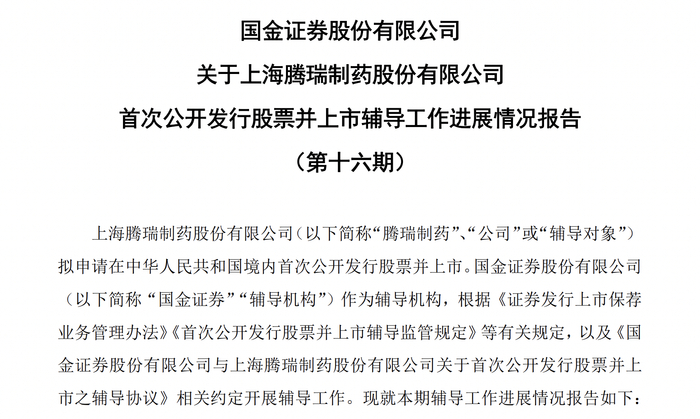 瑞财经 刘治颖 近日,上海腾瑞制药股份有限公司(以下简称:腾瑞制药)披露关于公开发行股票并上市辅导工作进展情况报告(第十六期),国金证券为辅导机构。