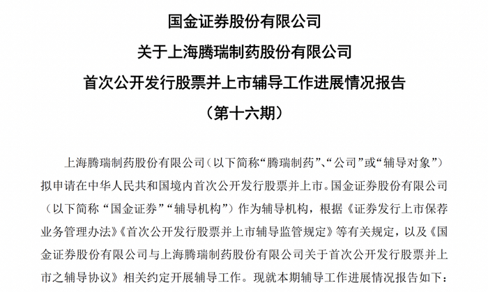 瑞财经 刘治颖 近日,上海腾瑞制药股份有限公司(以下简称:腾瑞制药)披露关于公开发行股票并上市辅导工作进展情况报告(第十六期),国金证券为辅导机构。