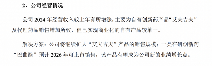 根据辅导报告,腾瑞制药2024年经营收入较上年有所增涨,主要为自有创新药产品“艾夫吉夫”及代理药品销售增加所致,但已实现商业化的自有产品较单一。腾瑞制药将继续扩大“艾夫吉夫”产品的销售规模;一类在研创新药“巴曲酶”预计2026年可上市销售,该产品有望成为公司新的业绩增长点。