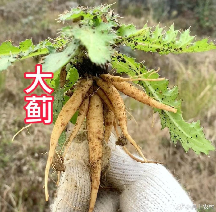 大蓟的茎叶上面长有刺,用手触摸有点扎手,但是嫩茎叶可以采摘来当野菜吃,可以凉拌也可以炒来吃,尤其是它的地下根茎似萝卜一样,常用来煲汤,且味道鲜美。