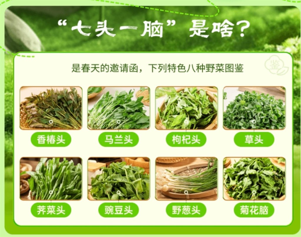 枸杞头、马兰头、荠菜头、香椿头、苜蓿头、豌豆头、小蒜头、菊花脑,从今年2月初开始,备受食客喜爱的“七头一脑”就陆续重返餐桌。华东地区必不可少的春菜“四大金刚”——香椿、蚕豆、雷笋、春韭,以及茉莉花、金雀花等可食用花也将陆续上架。