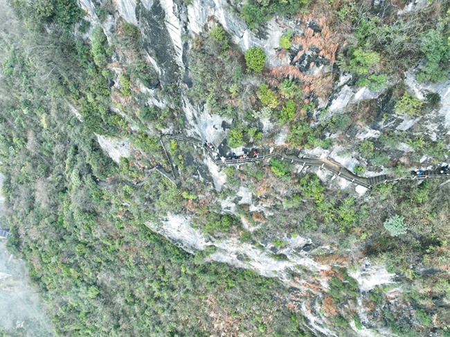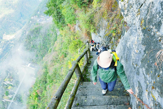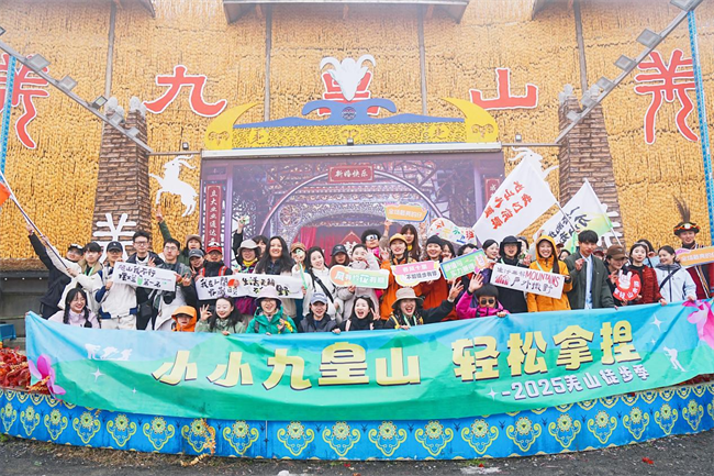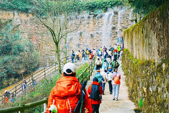 3月9日清晨,阳光灿烂,半山春雪熠熠生辉,来自四川周边各地的数百位徒步体验官们,开启了九皇山主景区徒步挑战之旅。此次挑战起点从观音崖开启,体验官们沿着蜿蜒山路前行,在指定区域挂上精心准备的祈福丝带与祈福牌,让美好的祝愿随风飘扬。随后,迎来此次徒步的重头戏——挑战绝壁栈道。栈道高悬于陡峭的山体之上,一侧是悬崖峭壁,一侧是万丈深渊,惊险刺激的氛围让人心跳加速,是一条极其考验体力耐力的登山路线。然而,体验官们毫不退缩,凭借着坚定的信念和勇往直前的精神,一步一步征服着这段充满挑战的路程,最终成功攀登到羌碉,完成打卡活动,赢取景区定制奖牌。