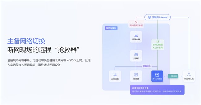 通过贝锐蒲公英完善的网络互备机制,不仅可确保电力监控数据持续传输,遇到网络故障时,运维人员也可通过专网远程访问设备后台,快速定位交换机过热原因(如硬件故障、负载过高),避免因单一设备宕机导致故障排查停滞。