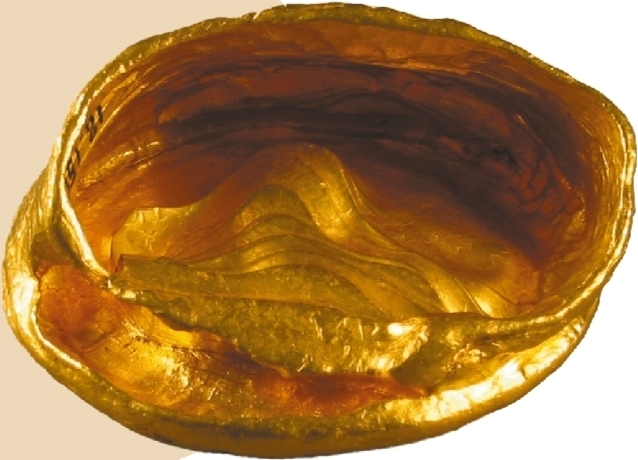 马蹄金 大连市普兰店区出土,共两件,现藏于旅顺博物馆。金块呈马蹄形,周壁从底向上内收,中间空。底部呈不规则圆形,刻有“上”字,侧面刻画有特殊符号。马蹄金含金量达百分之九十八,重约半斤。研究发现,西汉时期制造的马蹄金主要用于祭祀。