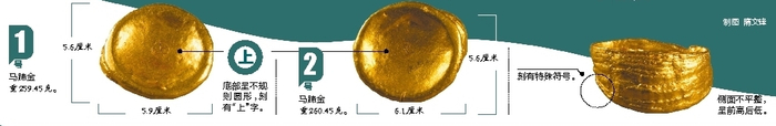 1号马蹄金底部呈不规则圆形,窄处直径为5.6厘米,宽处直径为5.9厘米,侧面刻画有“×××× |||”符号,重259.45克。2号马蹄金底部窄处直径为5.6厘米,宽处直径为6.1厘米,在侧面刻画有“××××”符号,重260.45克。两者底部皆刻有“上”字圆印。