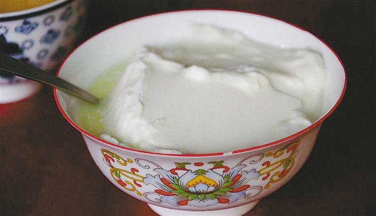除了常规的高蛋白大餐,西藏还有许多特色美食,酸奶拌饭便是夏日爽口美食之一。酸奶带着牦牛奶独特的鲜味,提炼后形如“豆腐脑”,白嫩滑溜,口感微酸与微甜交织,令人身心愉悦。在藏族世代延续的饮食文化中,酸奶拌饭因其丰富的营养价值,深受人们喜爱。