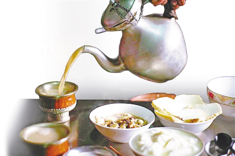人们平常吃的早餐有粥、包子、豆浆、面条等,而在高原地区,糌粑和酥油茶是当地人的营养早餐,也是藏族人餐桌上的必选。其中,酥油茶是为适应高寒环境而创造的特色饮品。它是将牦牛奶提炼的酥油与砖茶汤混合,加入盐调味制成的,口感浓郁醇厚。其高脂肪、高热量的特性,既能抵御严寒,又可缓解高原缺氧带来的疲劳,既是当地人的早茶,也是日常生活中的必需品。