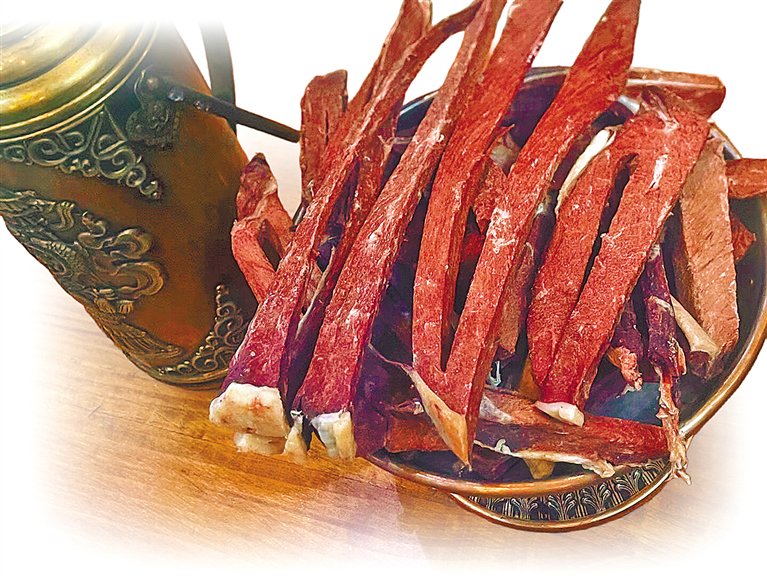 在高原,人们还热衷于原汁原味的零食,风干牦牛肉是藏族人民的冬季宝藏零食。风干牛肉必须在严寒的冬季制作才能保留其原汁原味,牦牛的后腿或里脊肉最适合做风干牛肉。把肉切成粗条,用盐巴或花椒、辣椒等香料揉搓,悬挂在阴凉的通风处,高原的严寒和干燥的空气促使牛肉自然风干。这样做出的肉干嚼劲十足,是真正的高原蛋白质,也是藏族人待客的美味。