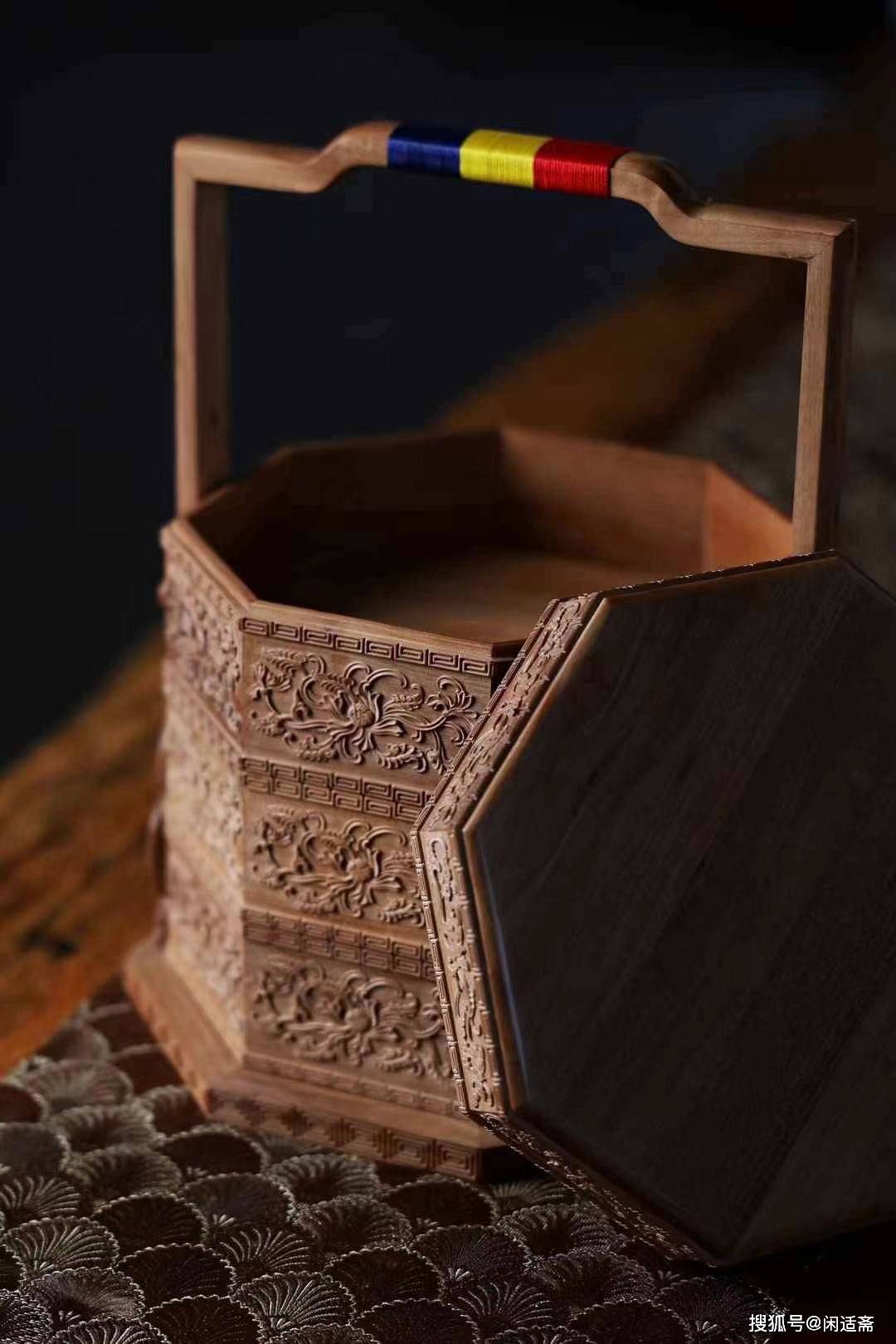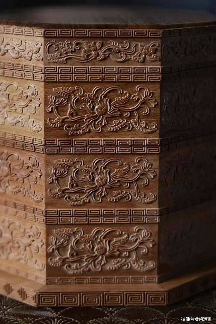 盒身之上,西番莲纹的精美雕琢更是为其增添了浓郁的文化气息,熠熠生辉。西番莲原产于美洲,自传入我国后,深受人们喜爱,其纹样广泛应用于各类工艺品。西番莲纹线条流畅婉转,花朵饱满绽放,枝叶舒展灵动,充满生机与韵律。在文化寓意层面,西番莲象征 “廉洁”,其纯净姿态宛如君子,不与世俗同流合污;同时寓意 “连绵不绝”,繁茂枝叶相互缠绕,恰似美好祝福与情谊,绵延无尽。工匠们运用精湛浮雕技艺,将西番莲纹栩栩如生地呈现,每一处细节都精雕细琢,花朵纹理、枝叶脉络清晰可见,深浅有致,立体感十足,为提梁盒注入丰富文化内涵与艺术魅力。