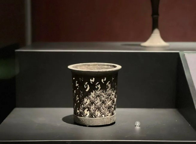 在湖北省博物馆“楚国八百年”展厅展出的湖北枣阳九连墩2号墓出土的铜熏杯。新华社记者 喻珮 摄