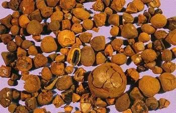 牛黄——又名牛宝和丑宝。指牛科动物黄牛或水牛的胆囊结石。天然牛黄的价格比黄金的价格还要高。牛黄完整者多呈卵形,质轻,表面金黄至黄褐色,细腻而有光泽。中医学认为牛黄气清香,味微苦而后甜,性凉。可用于解热、解毒、定惊。内服治高热神志昏迷,癫狂,小儿惊风,抽搐等症。外用治咽喉肿痛、口疮痈肿、疗毒症。